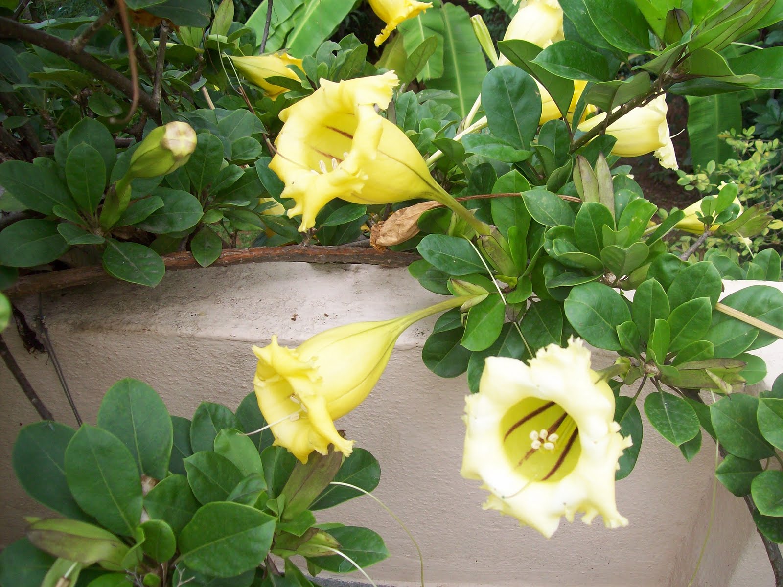 Tge goldend Chalice vine Solandra grandiflora is bravely putting out its huge trumpets in spite of the heavy rain.Camouflage